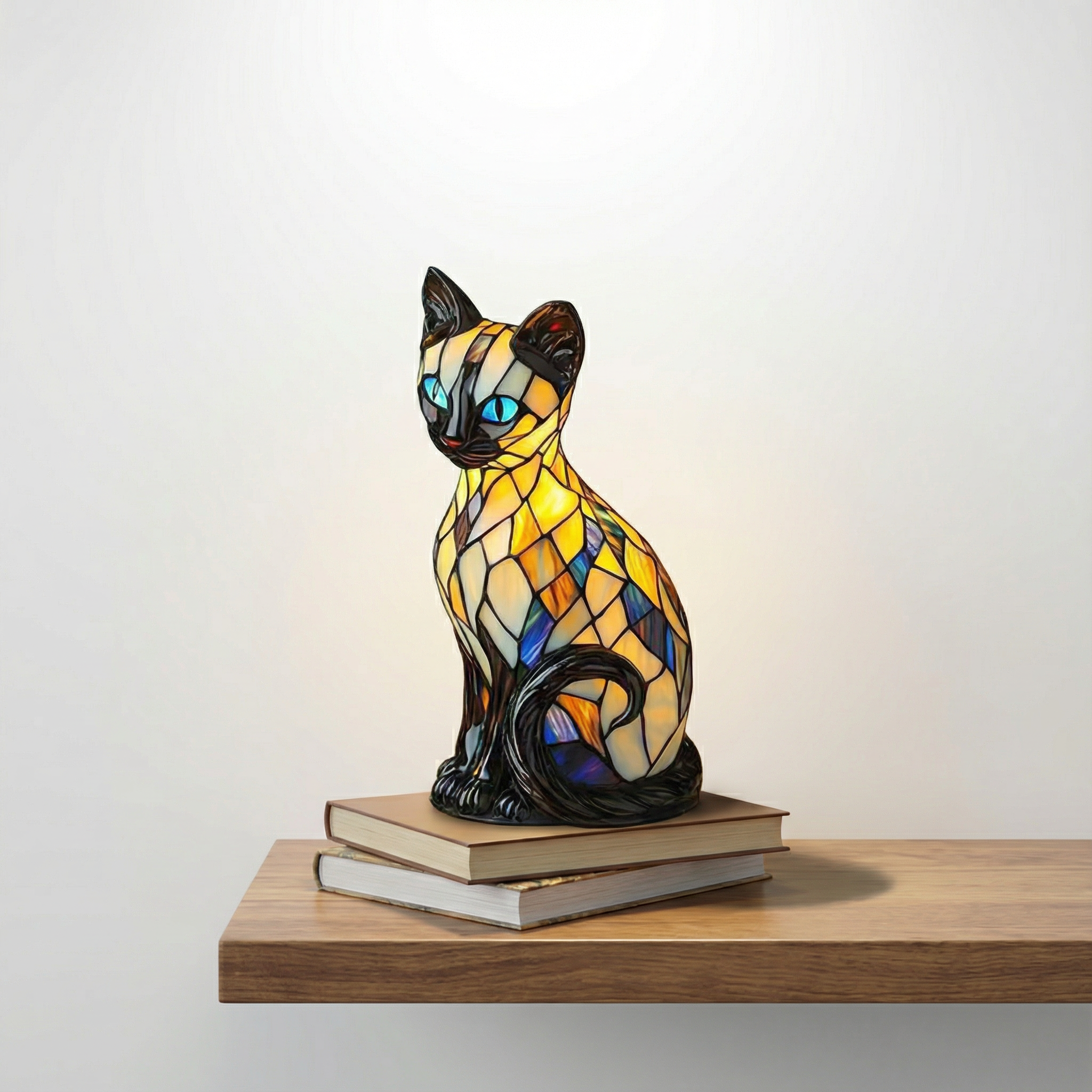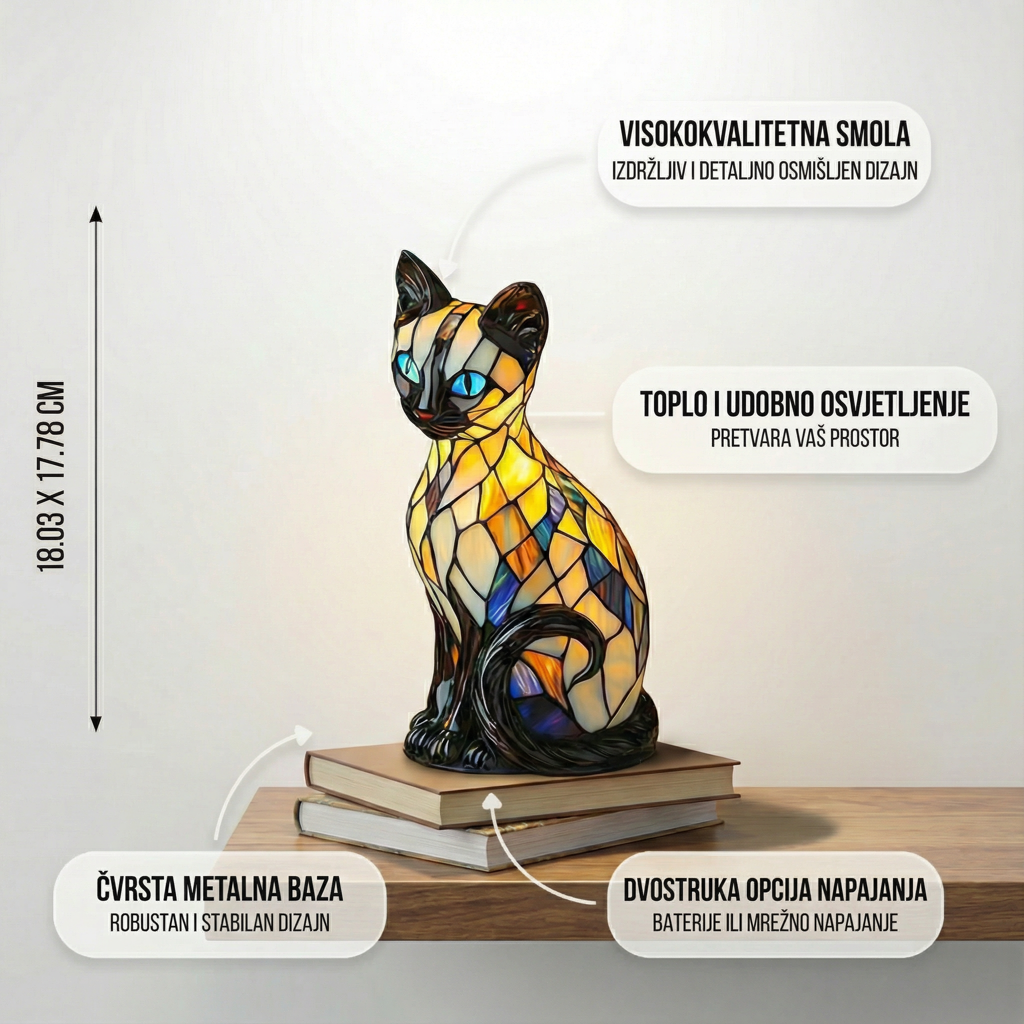 Lampa Mistična mačka je savršen dodatak za svakoga tko želi oživjeti svoj prostor. Njezin dizajn s živim bojama iz vitraža stvara veselu, odvažnu i jedinstvenu atmosferu. Lampa isijava blagu i umirujuću svjetlost koja svaki kutak pretvara u elegantno i ugodno mjesto. Njezine kompaktne dimenzije čine je idealnom za noćne ormariće, komode ili bilo koji prostor koji treba osvijetliti.