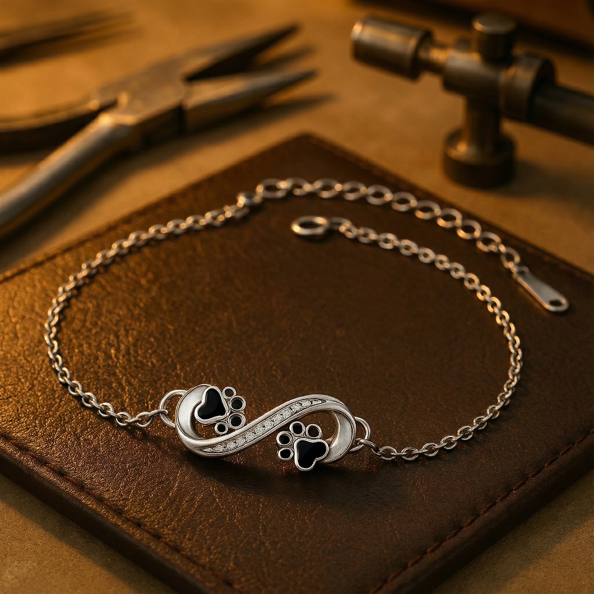 Beskrajni simbol znači "zauvijek" – a crne emajlirane šape čine ovu narukvicu bezvremenskim komadom nakita za sve ljubitelje životinja. Bilo da je to uspomena, poklon ili svakodnevni znak povezanosti – ova narukvica govori izravno iz srca.