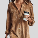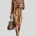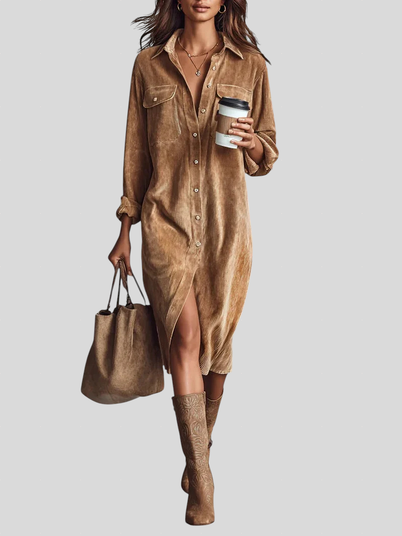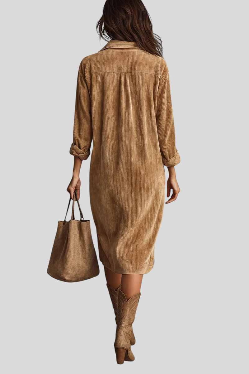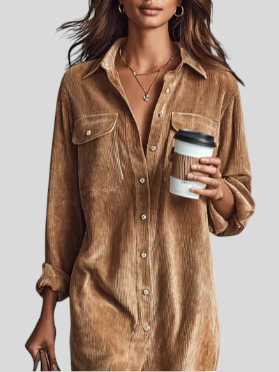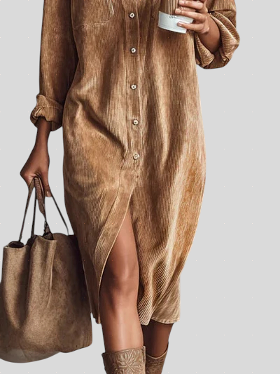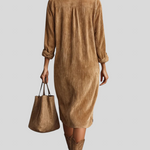Haljina koja u jednom dizajnu spaja sofisticiranost i udobnost. Midi kroj i tekstura baršuna pružaju moderan i ugodan izgled, savršen za svakodnevne trenutke ili posebne prigode. S gumbima sprijeda i ležernim krojem, lako se prilagođava različitim stilovima, omogućujući kombinacije od casual do elegantnih.